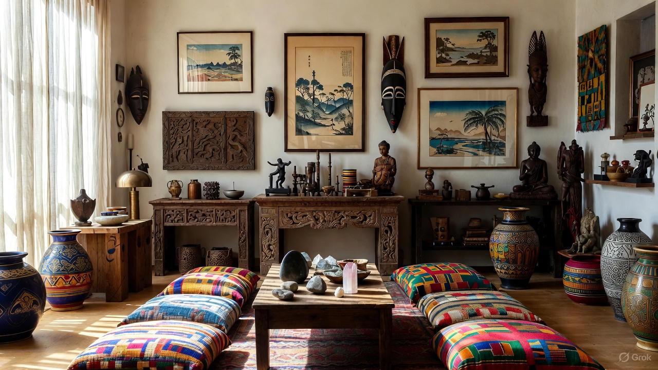 Associer un meuble minimaliste japonais avec un tapis berbère, combiner une poterie africaine avec un luminaire oriental ou marier un paravent asiatique à un mobilier contemporain peut donner naissance à une décoration singulière, à la fois cohérente et riche. L’idée est de laisser chaque pièce s’exprimer sans étouffer les autres, comme dans un dialogue esthétique où chaque élément trouve sa place.